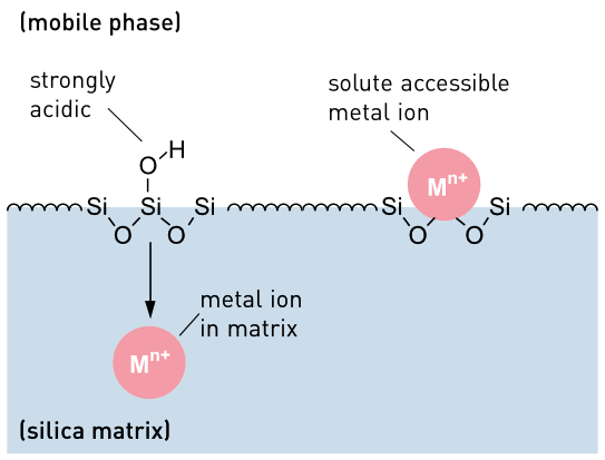 Increased acidity of silanols provides a higher possibility for ion-exchange interactions at any given pH. Moreover, metal ions present in the silica surface layer are able to interact directly with analytes that have Lewis-base properties.